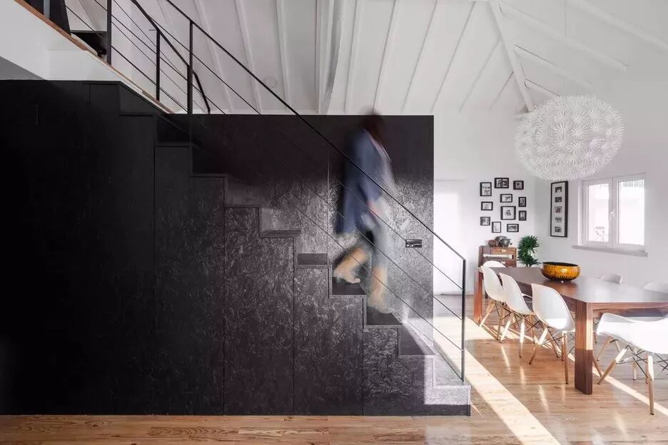 黑色的OSB,在原木色的OSB基础上,大胆用色,泼墨式的手法,黑色的相称下,OSB的纹理更加突出,也更加美好。